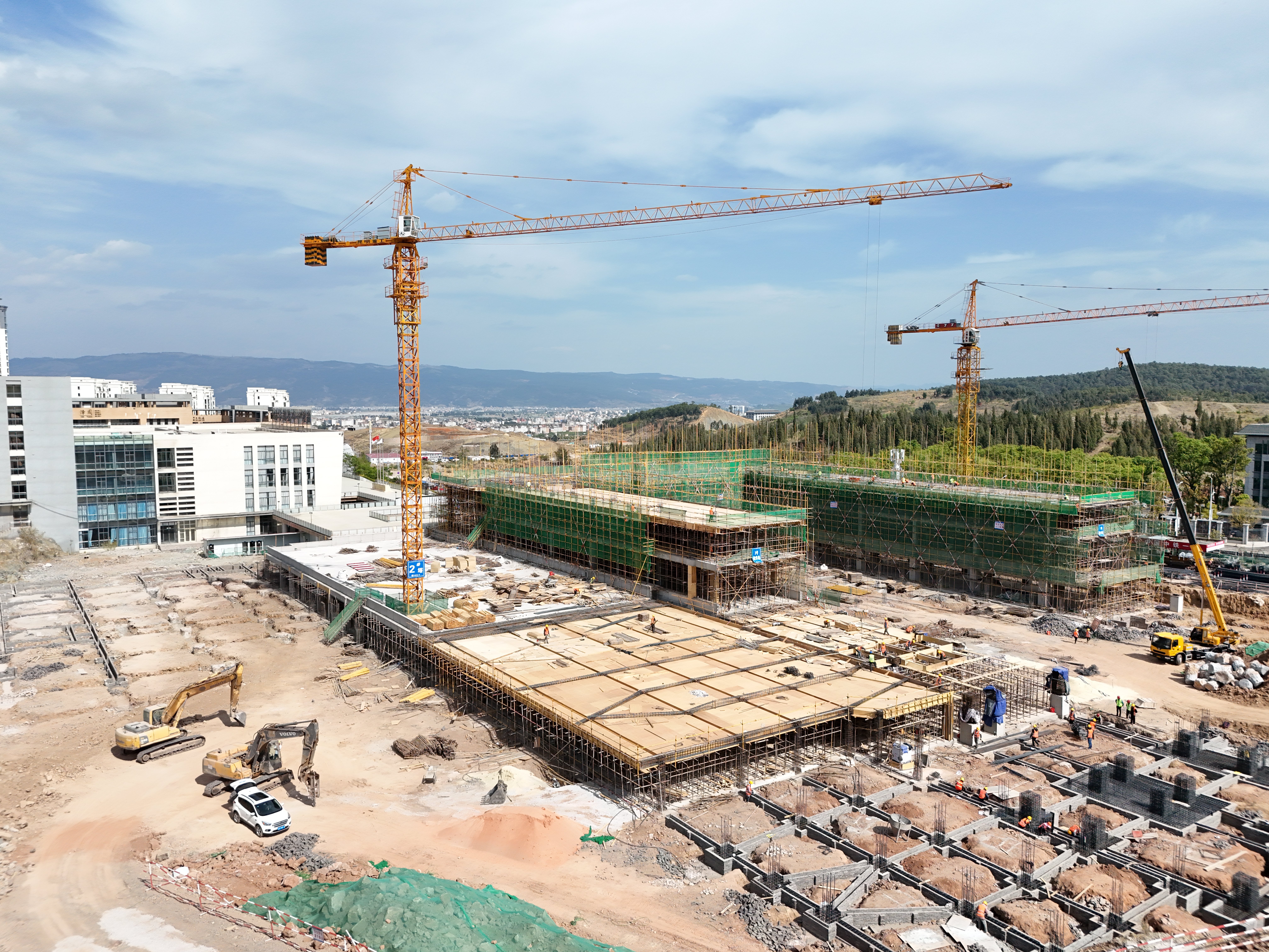 项目启动伊始,便以“高标准规划、高效率推进、高质量建设”为宗旨,锚定“完善功能、优化布局、赋能教育”的目标。2024年初,工地现场已是机械轰鸣、车辆穿梭,教学楼与风雨操场桩基深植地下,宿舍楼基础开挖有序推进,一派热火朝天的景象。至同年3月,3栋教学楼如春笋破土,均已建至3层;5月,1号、3号教学楼节节攀高,部分区域与2号楼同步跃至6层,建筑群初展雄姿。工人们头戴安全帽,绑扎钢筋、铺设模板、浇灌混凝土,每一道工序严谨细致,每一处细节精益求精。塔吊长臂挥舞,建材整齐堆叠,推土机与压路机轰鸣协作,共同勾勒出“知识殿堂”的坚实轮廓。