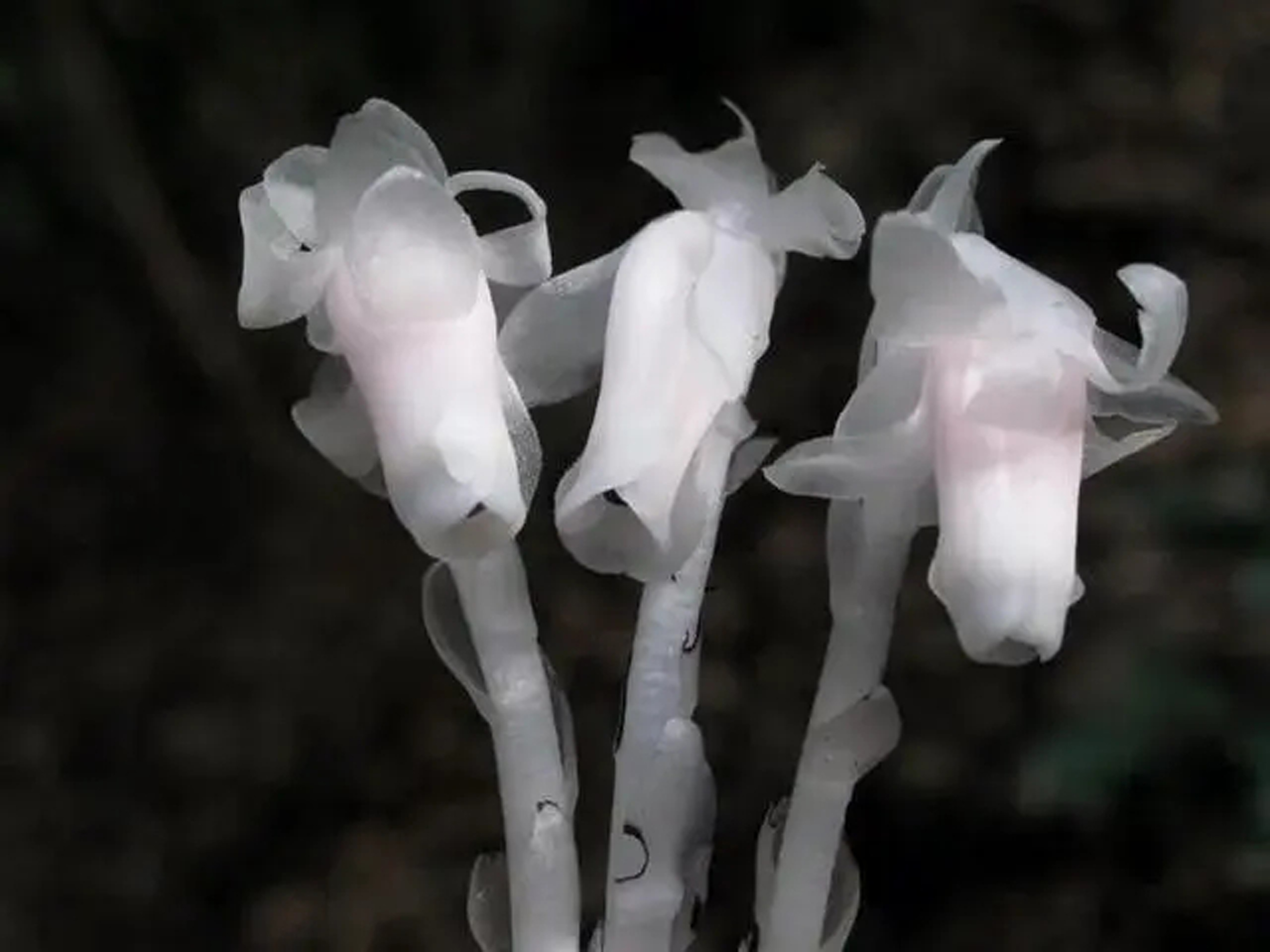水晶兰这个名称相当符合它的特质。细致观察,可以看出水晶兰花瓣通体透明,很像玻璃,又极其像是植物大战僵尸里面的豌豆射手,只有花蕊中间绽放出一点棕黑色,总给人一种婀娜多姿,冰清玉洁的感觉。