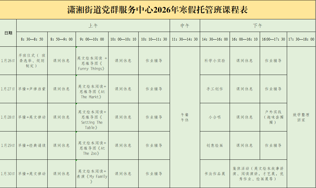 1.举办时间:2026年1月26日—2月6日(不含周末,共计10天),早上8:30-11:30;下午14:30-17:30。
