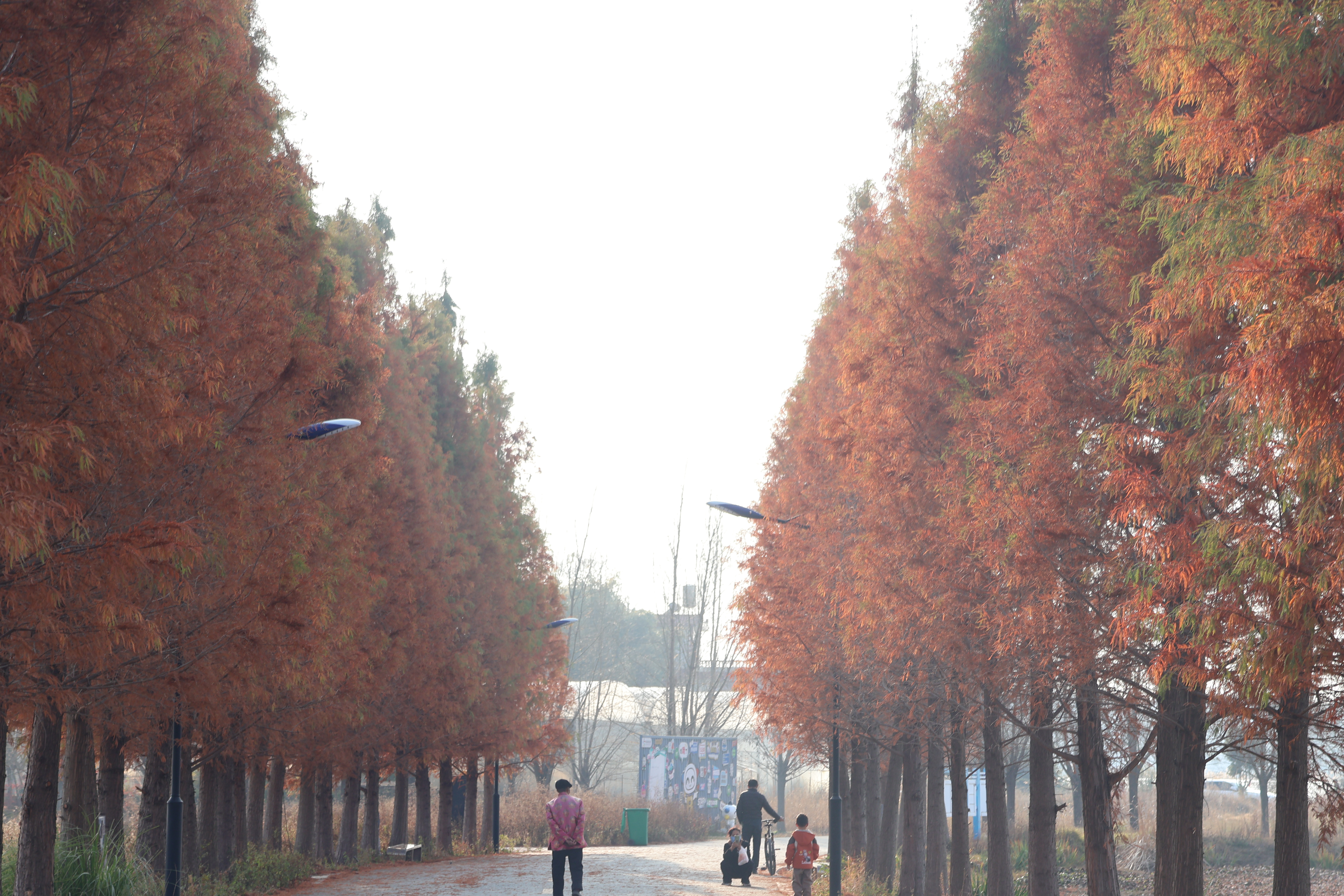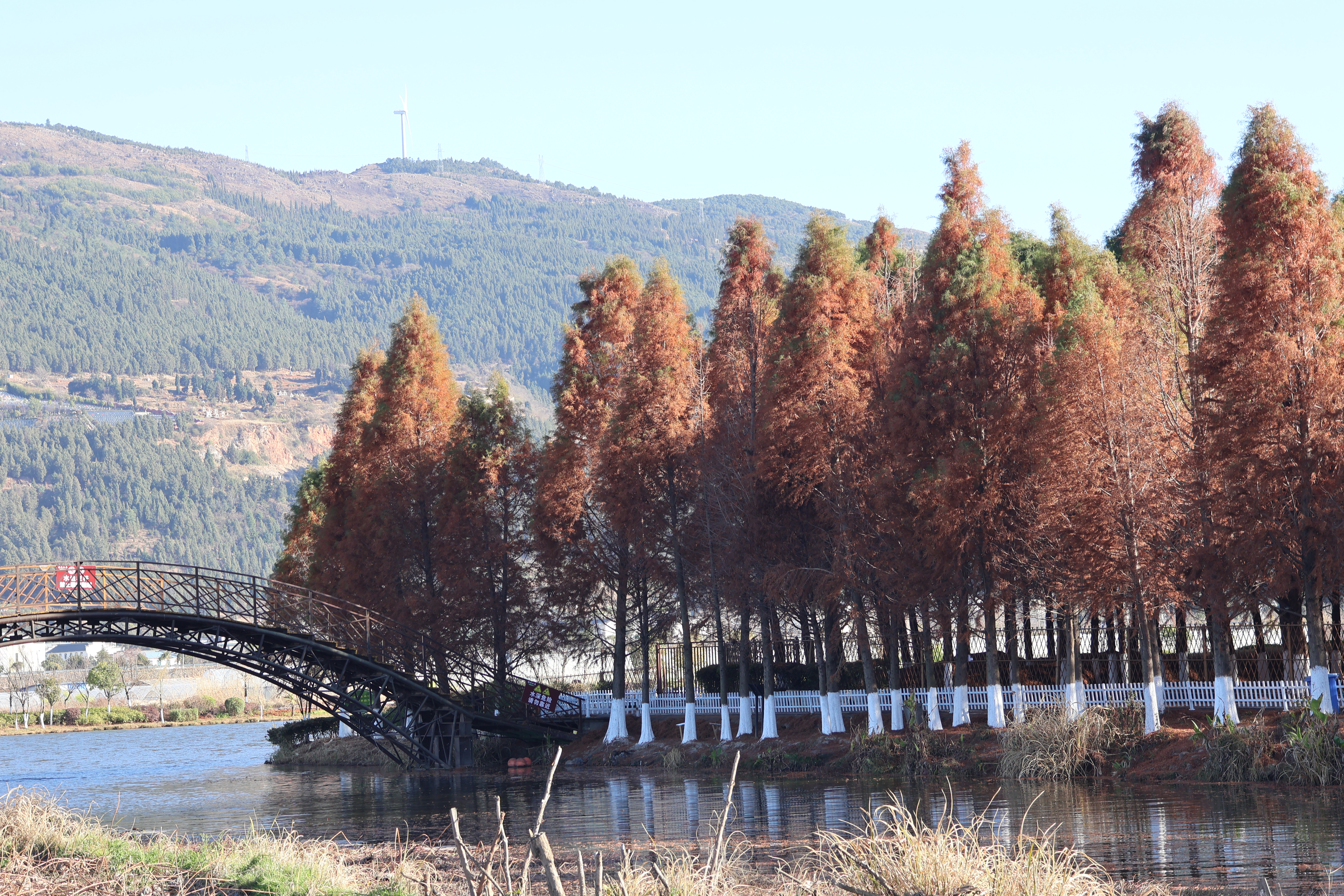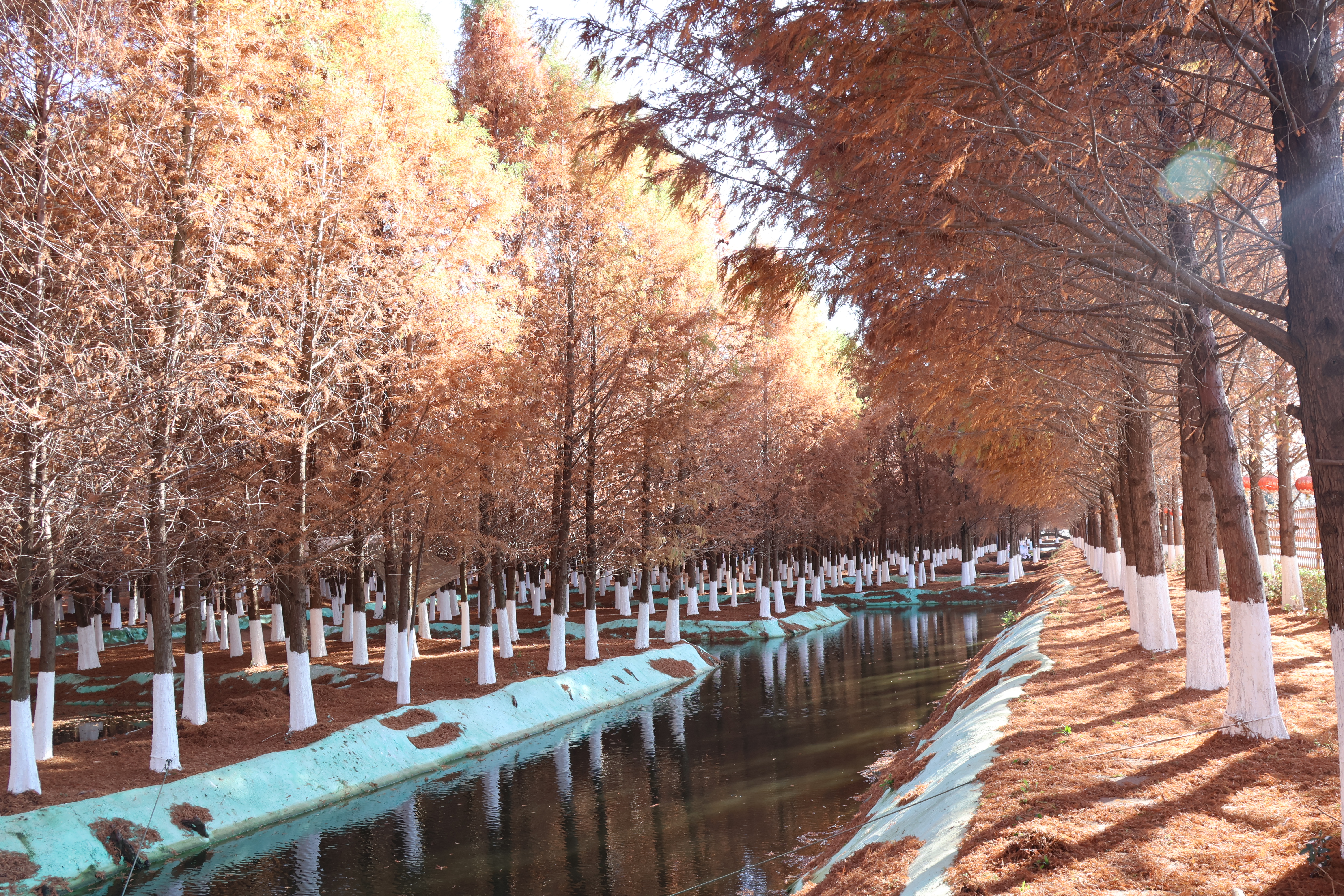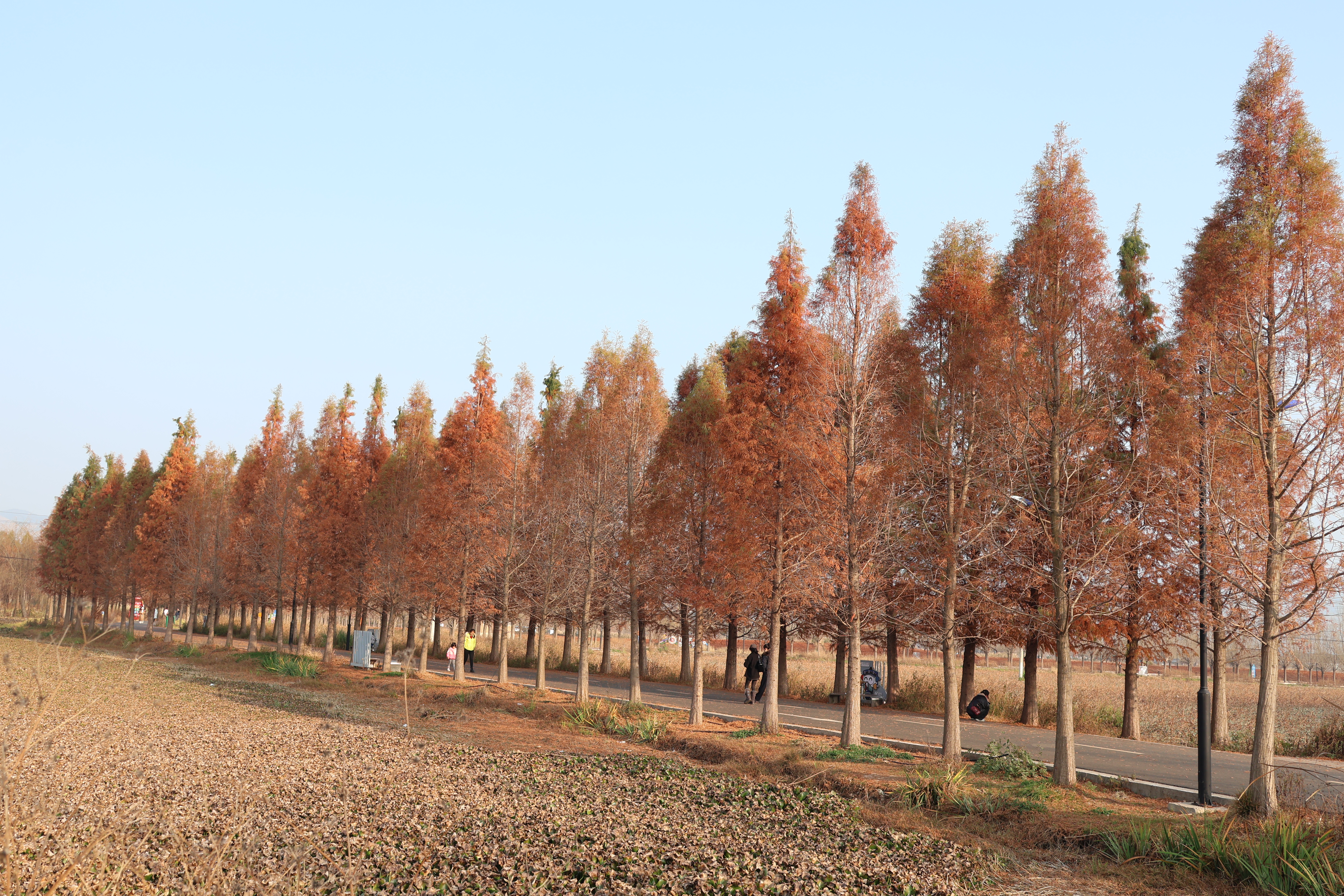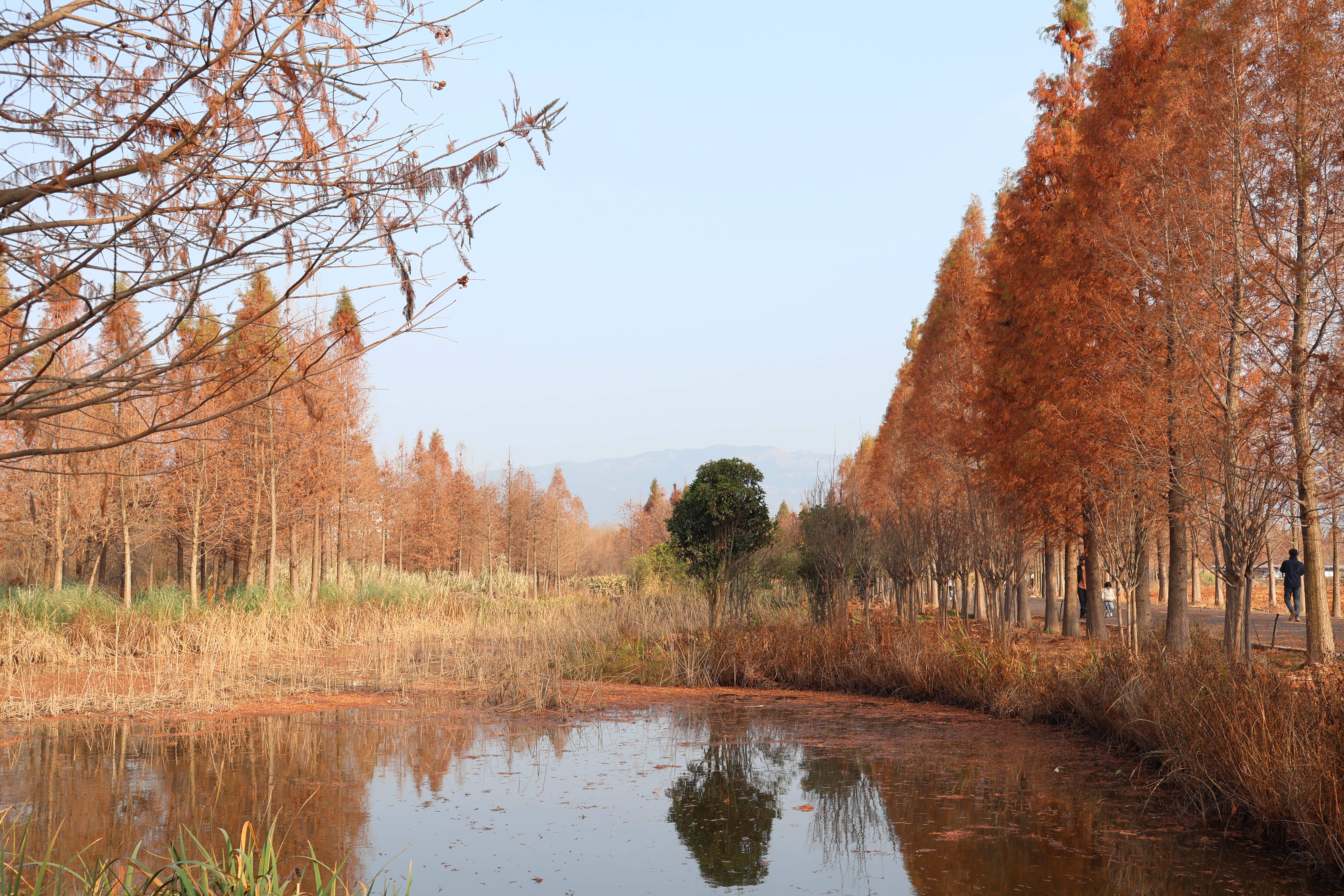 同在麒麟区的田园桂花综合体(文华街道境内),连片水杉林则是另一番风情。碧水萦绕的杉林里,水杉整齐成排,宛如训练有素的卫士伫立林间,彩叶倒映在澄澈湖水中,鎏金泛彩,打造出如梦似幻的“水中森林”盛景。清晨或黄昏时分前来,阳光为杉林镀上金边,光影效果最为动人,漫步林间步道,既可沉浸式感受彩叶环绕的浪漫,也能铺上野餐垫小憩,在远离城市喧嚣的静谧里,享受冬日暖阳与自然之美。